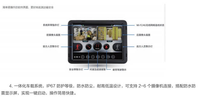 4.智能集成化設(shè)計(jì),一鍵開啟車載系統(tǒng),AI精準(zhǔn)識別、人車防撞、車車防撞、盲區(qū)防撞等。