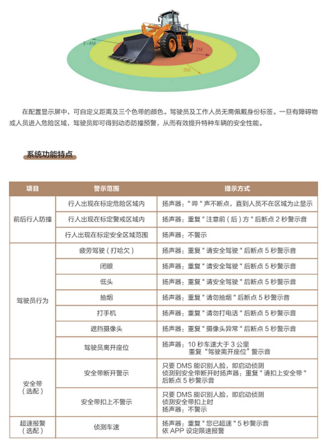 特種車輛智能識別防撞預(yù)警系統(tǒng)是專為工程車輛叉車、裝載機(jī)、挖掘機(jī)、推土機(jī)、礦山港口移動車輛設(shè)備所設(shè)計(jì)的智能識別防撞預(yù)警安全裝置,能夠?qū)崟r(shí)偵測工作區(qū)域的危險(xiǎn)狀態(tài)并提供警示,有助于提升預(yù)防工程特種車輛作業(yè)安全。一旦有障礙物或人員進(jìn)入危險(xiǎn)區(qū)域,駕駛員可得到動態(tài)防撞預(yù)警并發(fā)出報(bào)警進(jìn)行實(shí)時(shí)減速或停車,該系統(tǒng)能在各種復(fù)雜廠區(qū)路況及工礦環(huán)境中幫助駕駛員避免危險(xiǎn),預(yù)防事故發(fā)生減輕壓力,提供豐富的駕駛員輔助環(huán)境感知等功能
